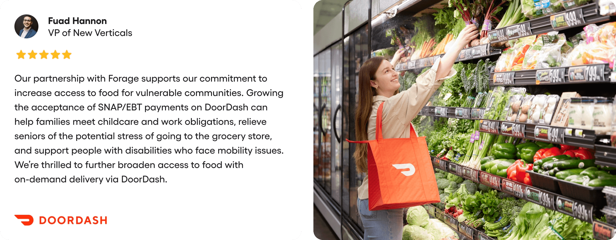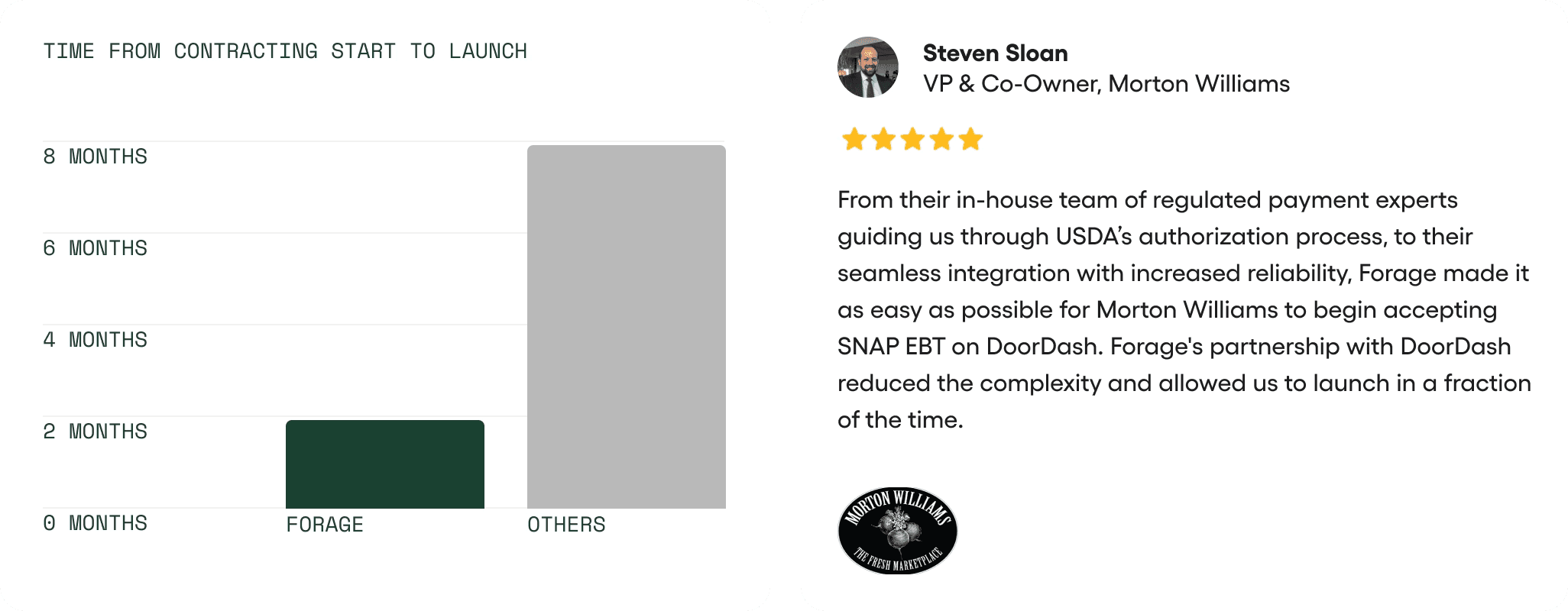 From launching a single store location to onboarding multiple banners with franchisees, Forage's prebuilt DoorDash EBT SNAP integration and modern platform make it simple to get started.
